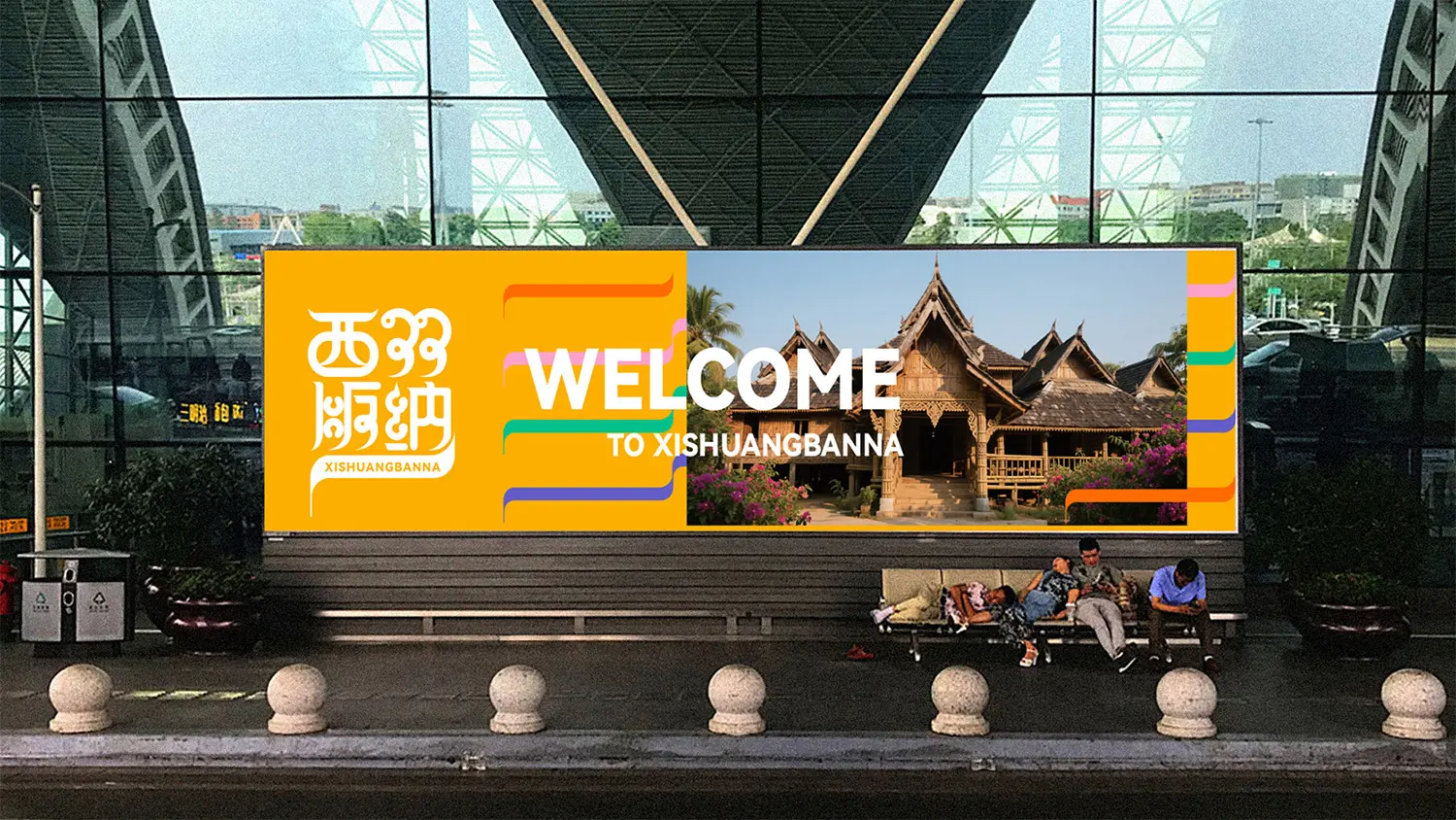 标识基于汉字“西双版纳”进行优化变体。转角与收笔线条融入傣文的圆润感与流畅性:古典傣文的云纹韵味与汉字骨架实现了创造性的融合。